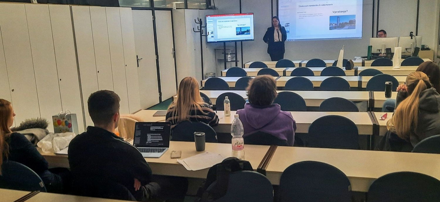 Maja Mušič, dipl. ekon., je predstavila vidik kakovosti v finančnih storitvah, zlasti pri pridobivanju in preverjanju komitentov za avtomobilski leasing. Kot strokovnjakinja iz družbe NLB Lease&Go je poudarila pomen analize bonitete strank, obvladovanja tveganj ter zagotavljanja finančne kakovosti v postopkih odobravanja lizingov. S praktičnimi primeri je prikazala, kako se teoretični koncepti kakovosti udejanjajo v vsakodnevnem poslovanju finančne institucije.