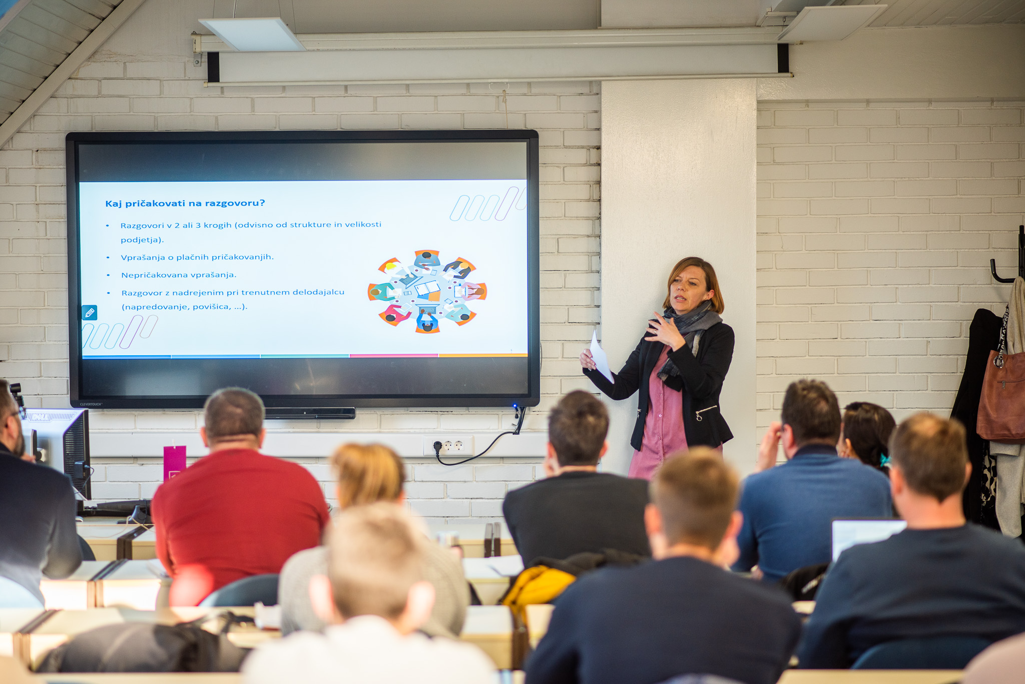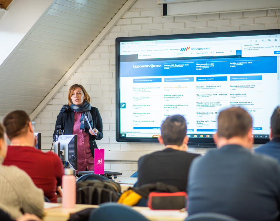 Gostujoče predavanja je pričela Mirjam Kmetič s kratko predstavitvijo podjetja ManPower. ManpowerGroup Slovenija je hčerinsko podjetje svetovne korporacije ManpowerGroup, ki ima skoraj 3.800 pisarn v več kot 80 državah in je vodilno podjetje na področju zaposlovanja in posredovanja dela, saj vsako leto zaposli več kot 4,4 milijona iskalcev zaposlitve. Ponuja inovativne in celovite kadrovske rešitve. Da bi svojim strankam zagotovili najbolj kakovostne storitve, združujejo najboljše svetovne prakse z lokalnim znanjem in veščinami, razdeljene na štiri področja: Iskanje & selekcija, mednarodna mobilnost, raziskave ter razvoj znanosti.