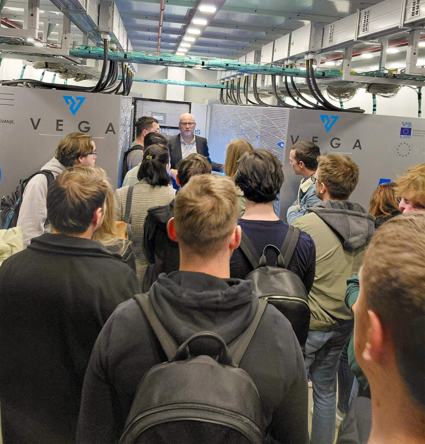 Med obiskom so študentje spoznali superračunalnik VEGA, ki je bil zasnovan kot ključni del projekta HPC RIVR za nadgradnjo slovenskih raziskovalnih infrastruktur. VEGA je bil eden prvih sistemov, dobavljenih v okviru Skupnega podjetja EuroHPC, in je pomembno povečal računske zmogljivosti Slovenije ter Evropske unije.